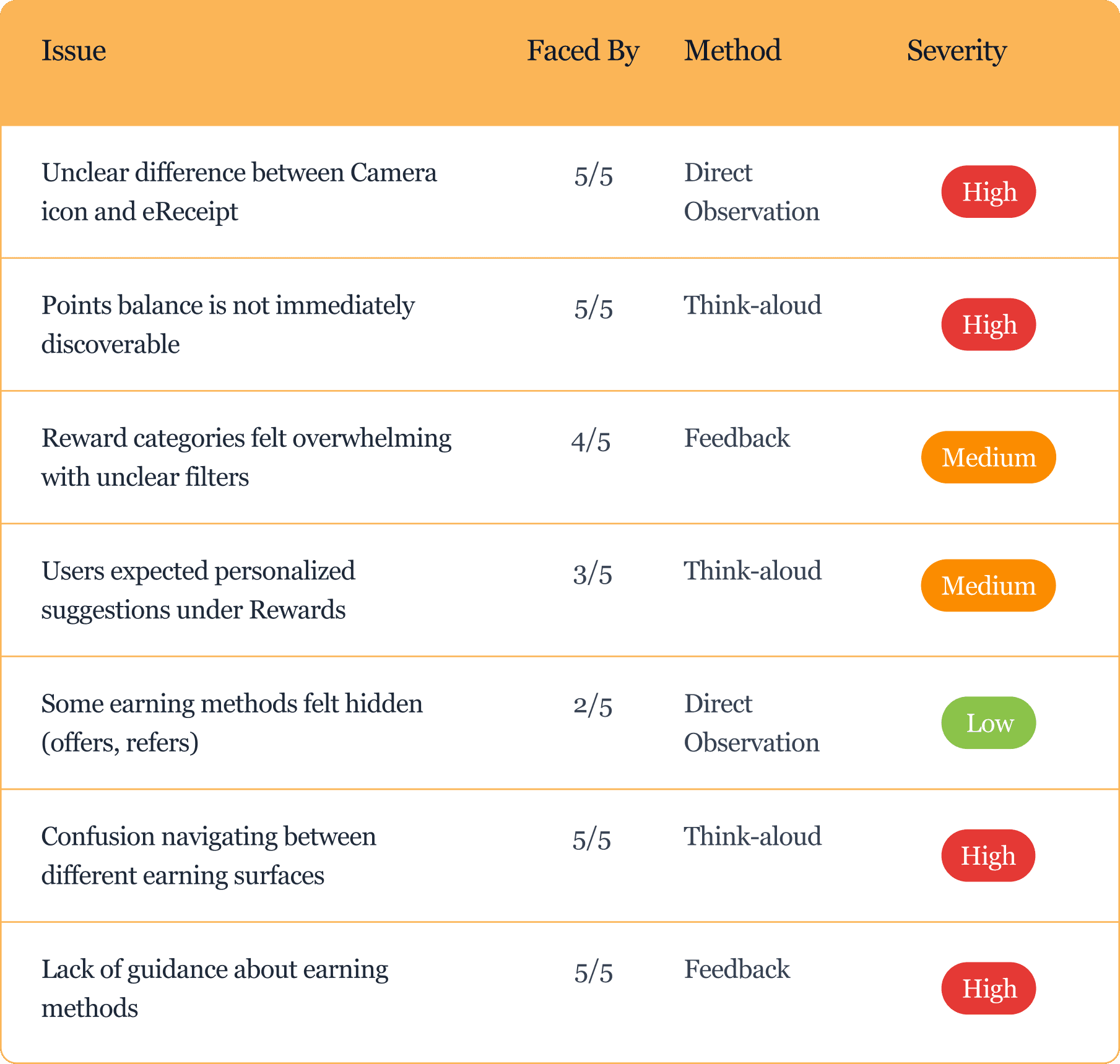 Watching people use Fetch gave me a clearer sense of where the experience feels smooth and where it creates hesitation. Moments like choosing how to upload a receipt or figuring out where points are shown reminded me how much users rely on clear cues to feel confident.