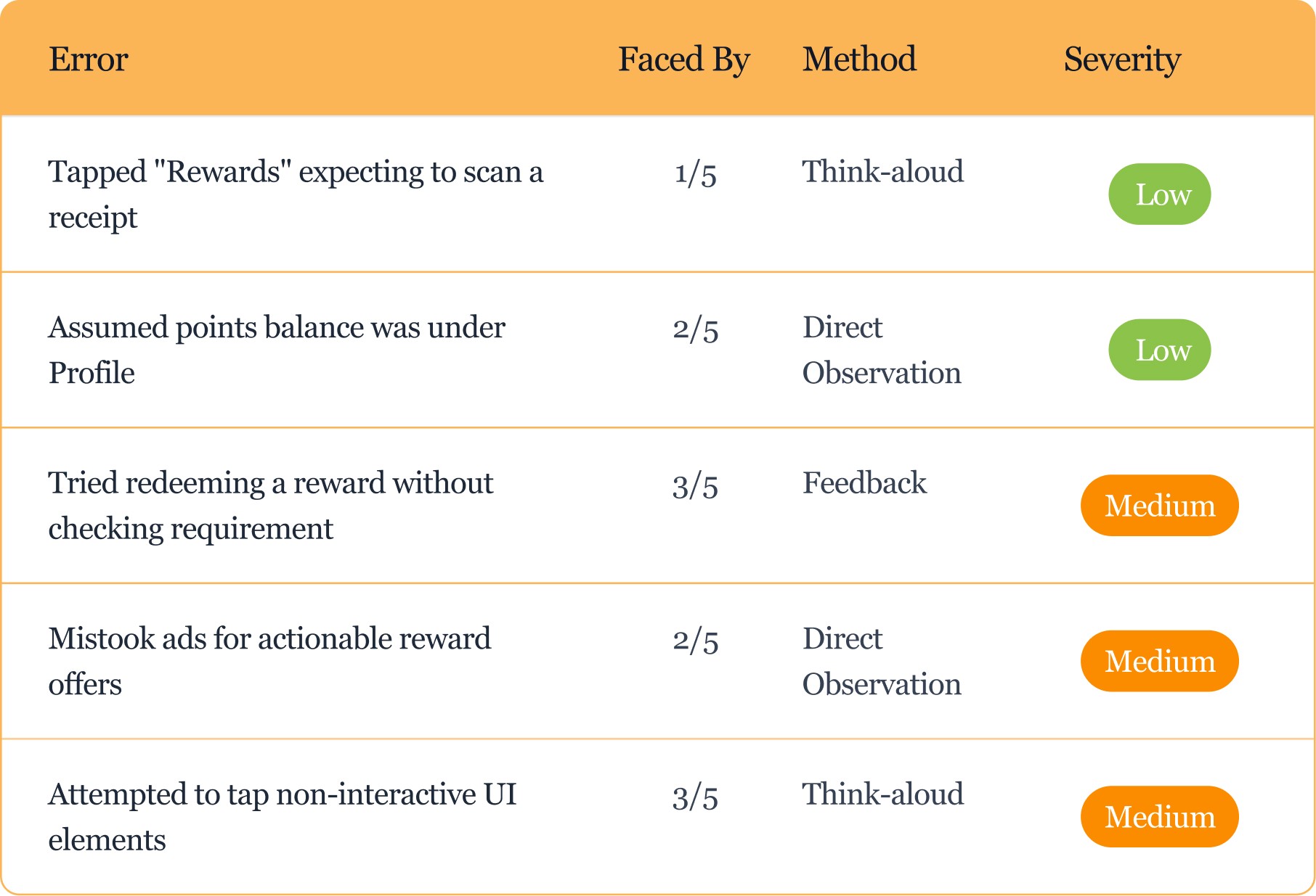 Errors—unintended actions caused by misunderstanding or unclear interface signals—were also documented. These helped categorize findings into two groups: 'Issues' and 'Errors', representing both structural design problems and user misinterpretations.