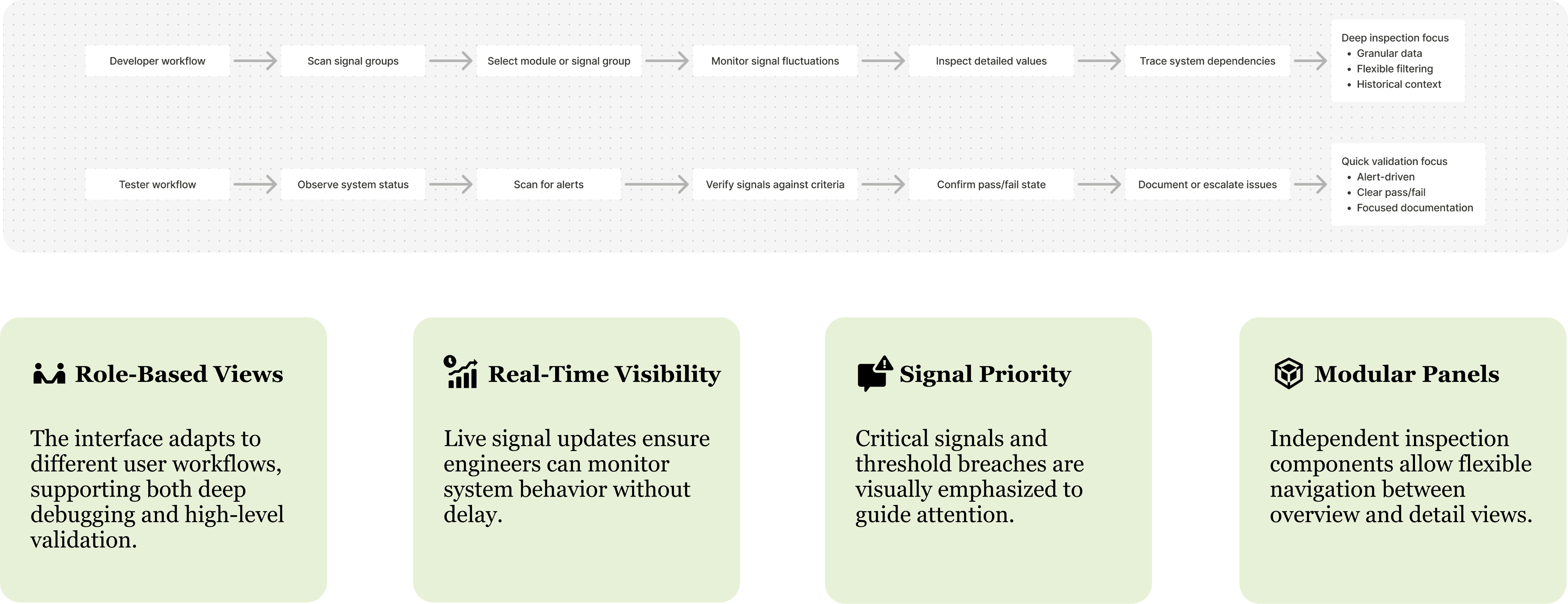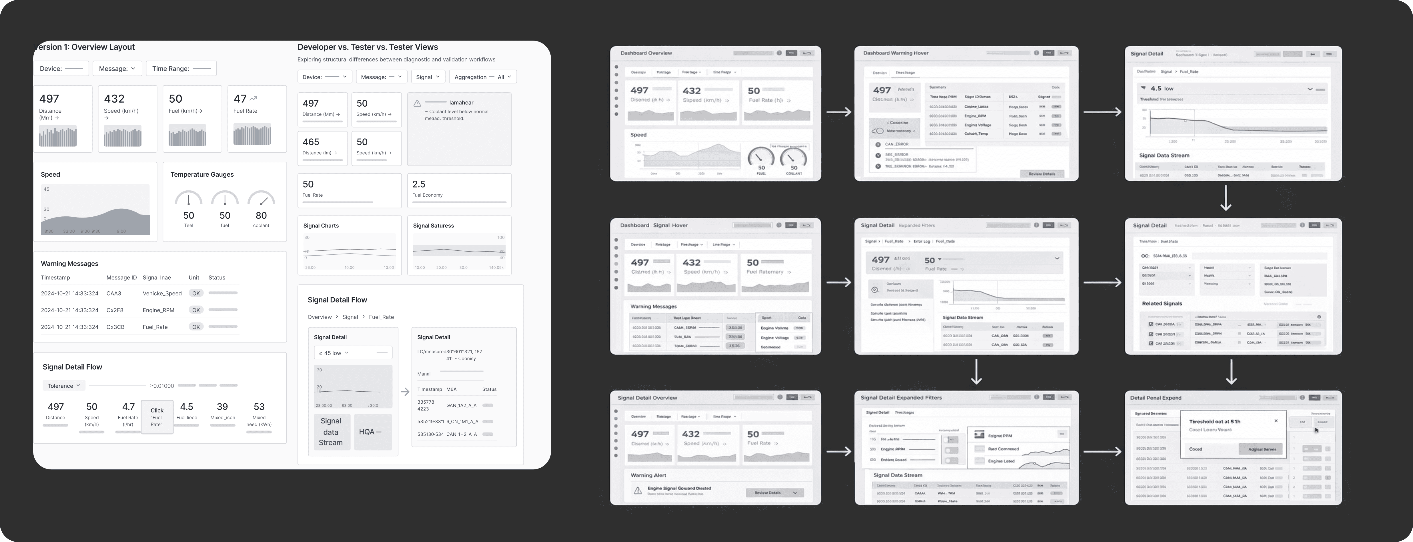 Initial wireframes highlighted the need for clearer signal prioritization, more distinct role-based views, and improved transitions between overview and detailed panels. Usability testing confirmed that while the structure reduced data overload, users still required stronger visual cues and simplified inspection flows.