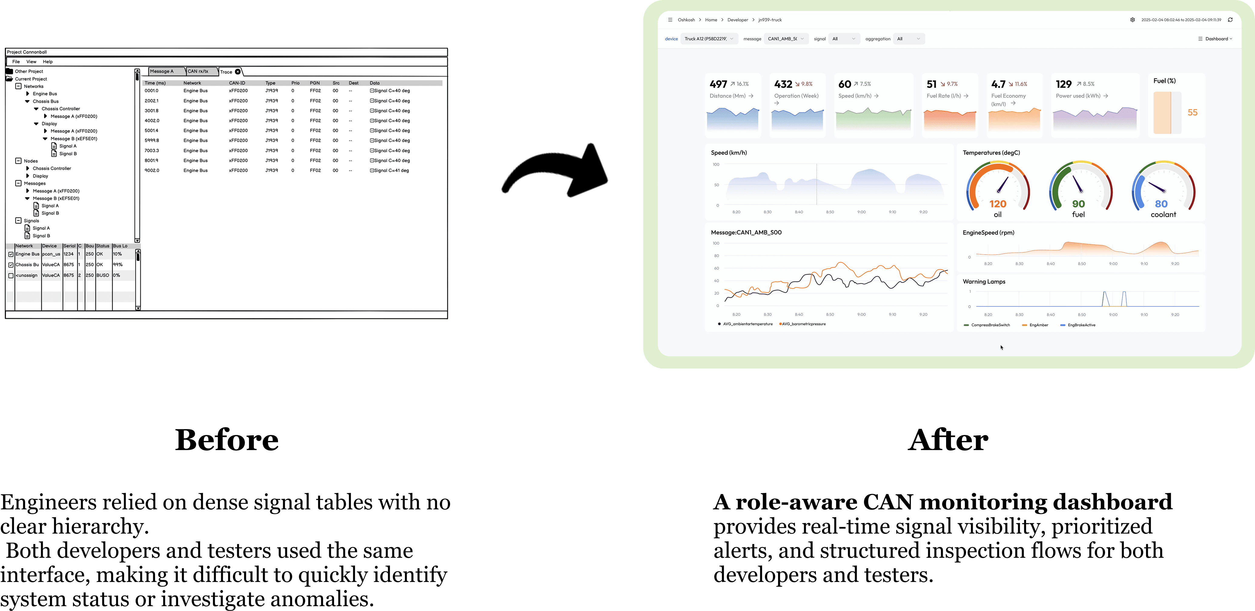 Through iterative adjustments and stakeholder feedback, the dashboard evolved into a layered system that balanced real-time visibility with focused analysis, making it more aligned with real-world engineering tasks.