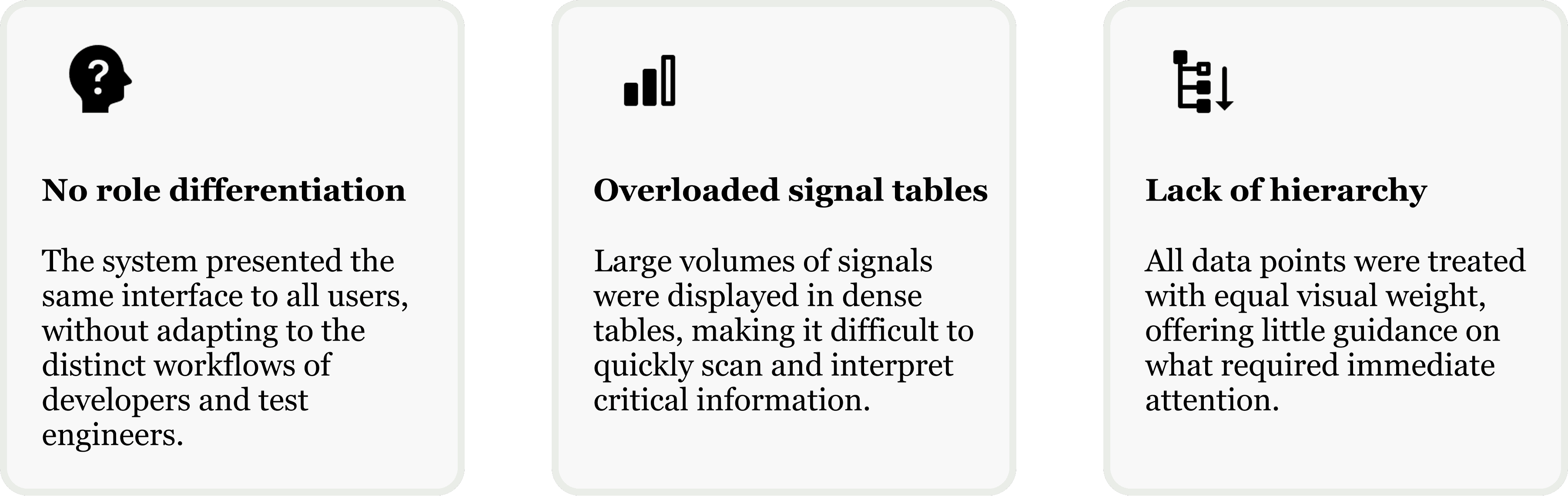 To move forward, I worked closely with developers, test engineers to align on workflow expectations and signal hierarchy.This collaboration led to several key insights that defined the core components of the redesigned dashboard.