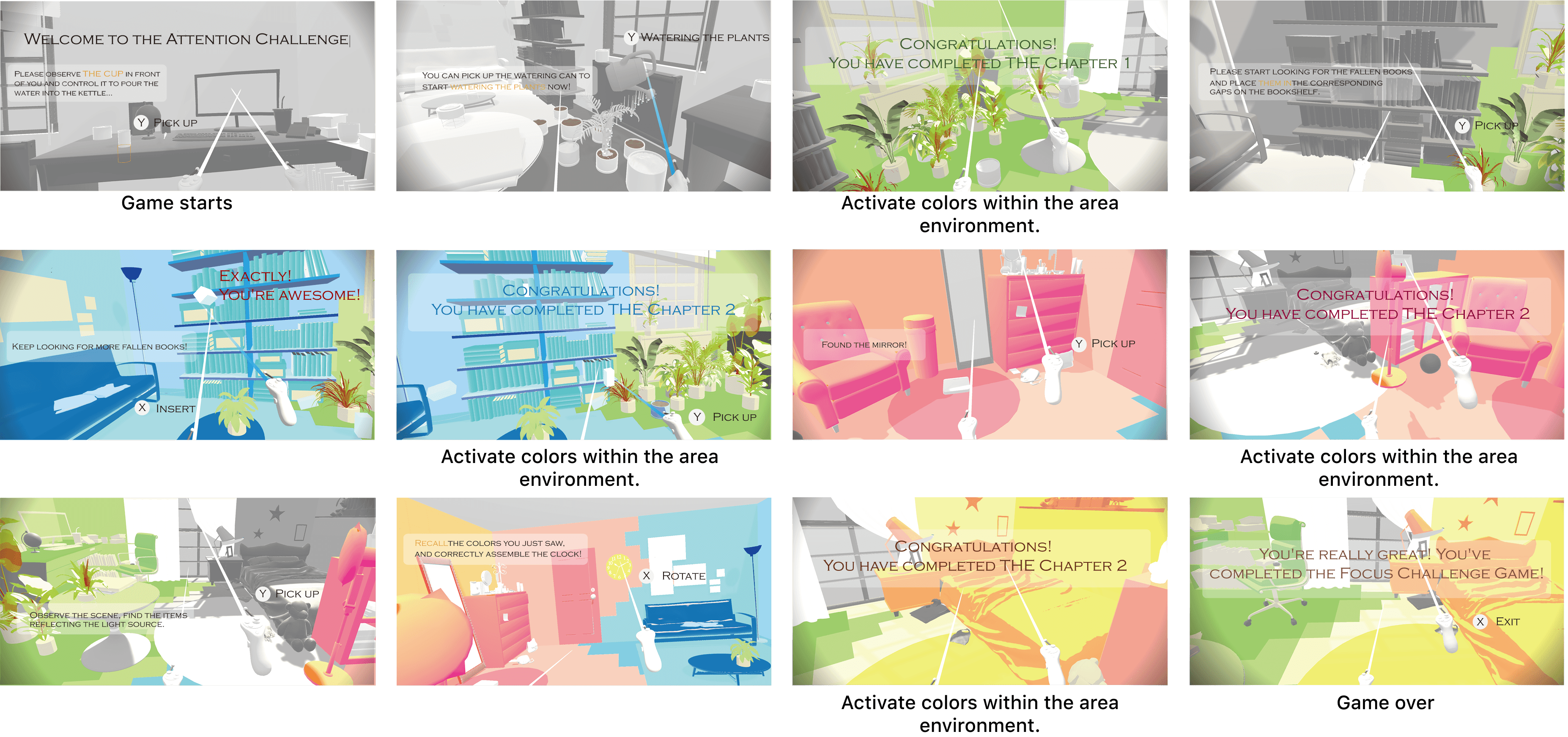 To address this issue, we developed a virtual reality game that combines entertainment and education, designed specifically to help players improve their attention levels. Through a series of engaging levels that gradually increase in difficulty, along with stimulating audiovisual scenarios, players are encouraged to sharpen their focus.