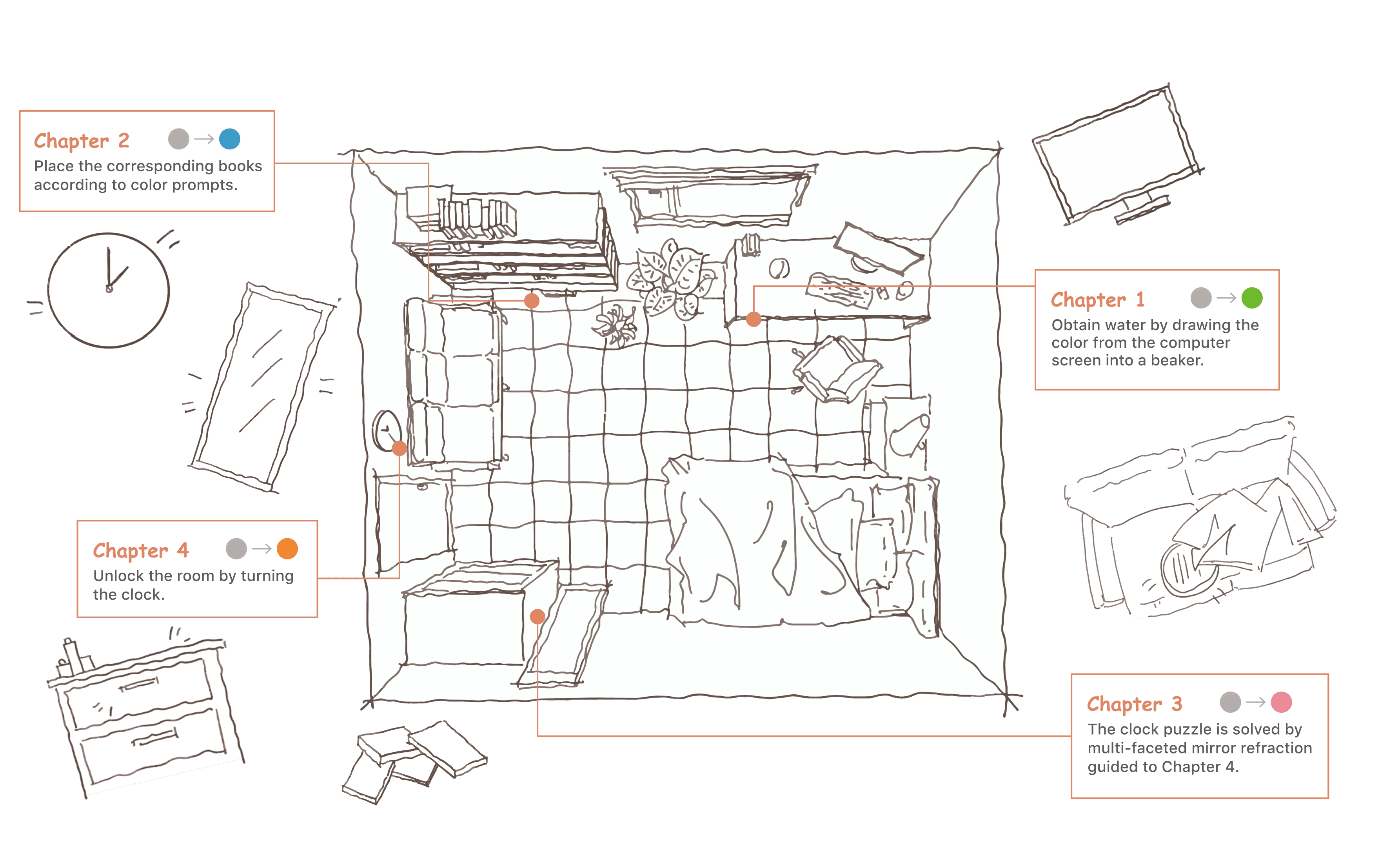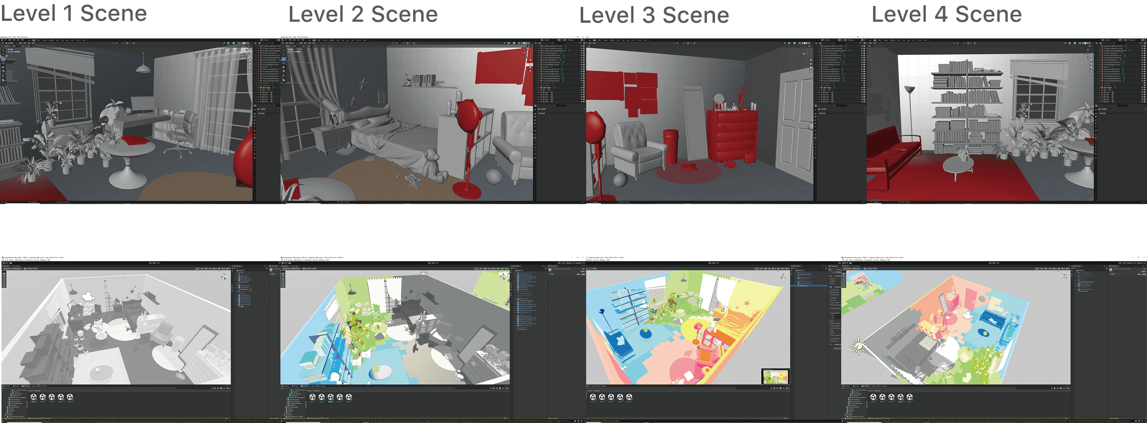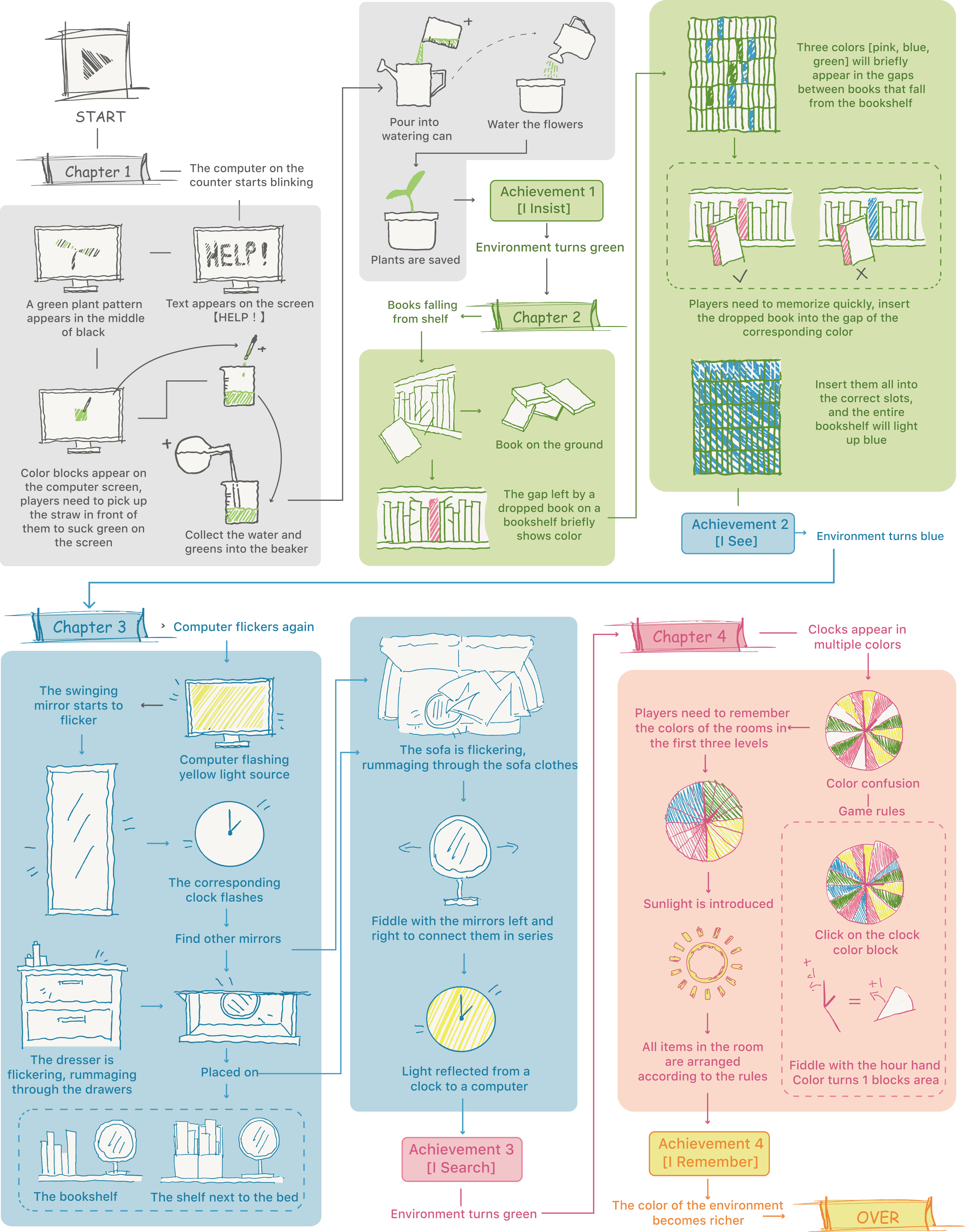 In our initial vision, the game consisted of four chapters, with a color change after each chapter to indicate the next level.